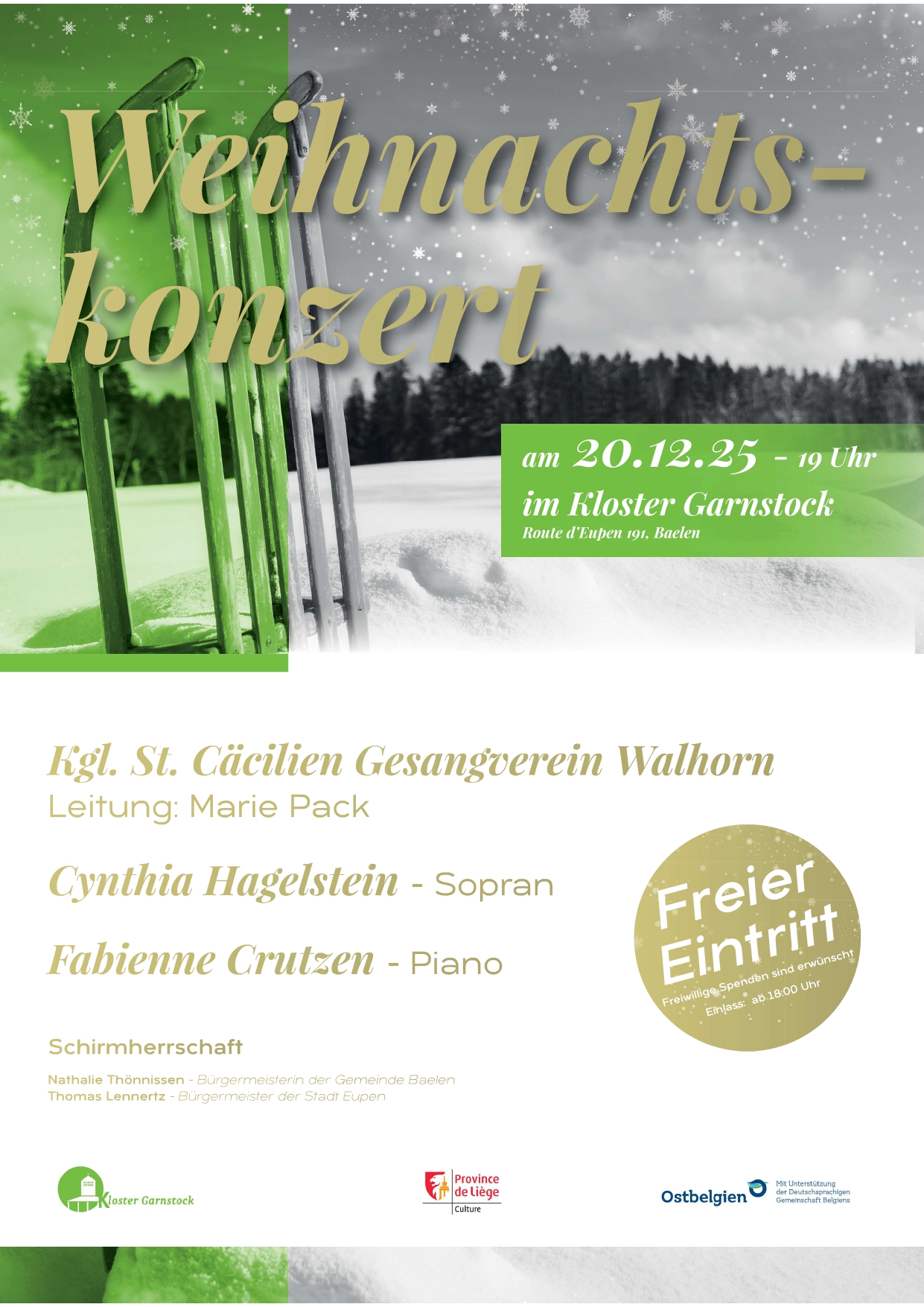 Kloster Garnstock Eupen Eupener Strasse 191, Baelen, BelgiumConcert de Noël avec la chorale Sainte Cécile de Walhorn sous la direction de Marie Pack, Fabienne Crutzen au piano & Soliste : Cynthia Hagelstein Une soirée festive pleine …